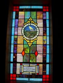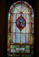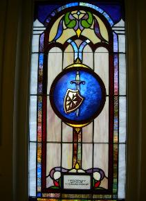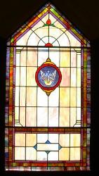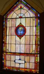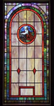 Below are examples of our most popular type of stained-glass window for churches due to their unique beauty as well as their affordability. This particular type of custom stained-glass window begins with a compilation of opalescent glass based on a specified color scheme. Then, a medallion is chosen to become the focal point of a story told under which a dedication or memorial plaque is placed in honor of a loved one. |